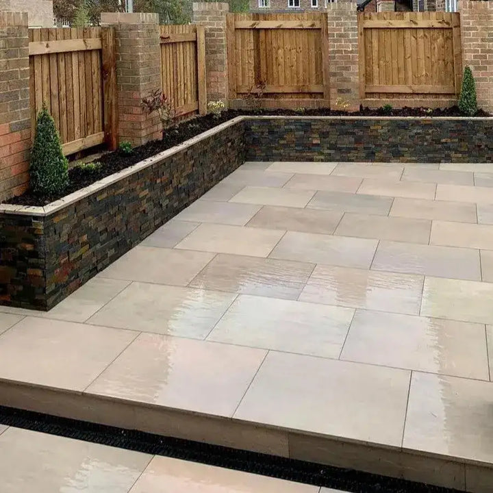 Raj Green porcelain paving artfully imitates the nuanced green and light brown tones, as well as the delicate textures found in Raj Green sandstone. This option is perfect for customers who admire the charm of traditional natural stone while seeking the advantages that come with porcelain tiles.